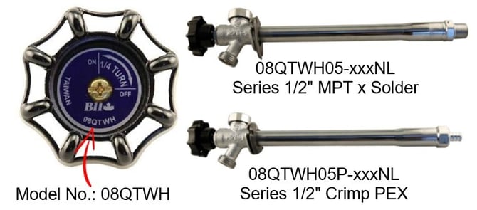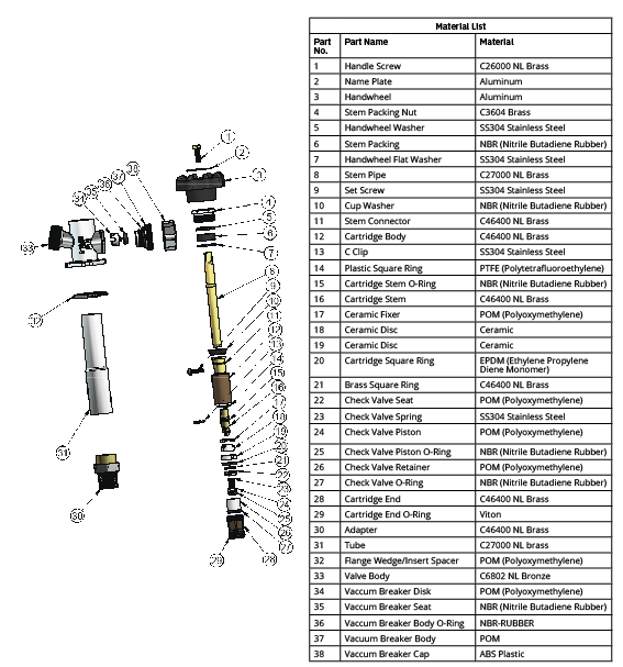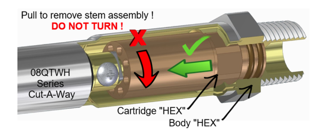 Do not try to turn out the stem assembly! Quarter Turn Wall Hydrants Stems do not turn in and out of the valve body in the same way that Multi-Turn wall hydrant stem assemblies. When the packing nut No. 13 has been disengaged from the valve body the stem is simply pulled out of the body the valve cartridge has a HEX shape that slides into a HEX shaped pocket in the body which keeps the valve assembly from turning when the handle is operated. If you attempt to turn it out, you will break the stem off the valve cartridge assembly. Never turn the handle more than the quarter turn (90°) rotation as shown on the identification disc in the handle.