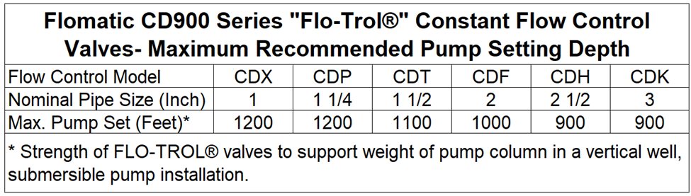 Only the Flomatic CD900 Series "Flo-Trol®" Constant Flow Control Valves, manufactured with strong 316 stainless steel valve bodies have “Maximum Recommended Pump Setting Depth” ratings!