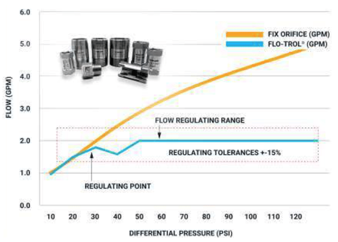 OPERATION: Flo-Trol® automatic flow control valves are designed to give constant flow over wide ranges. The valve's design has no moving parts; rather a self-cleaning flexible orifice that varies in size with applied pressure so that a constant flow rate is maintained.