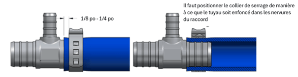 Insérez le raccord dans le tuyau jusqu’à ce que celui-ci touche l’épaule du raccord. Glissez ensuite le collier vers le raccord, en le positionnant à 1/8 pouce ou ¼ pouce de l’extrémité du tuyau.