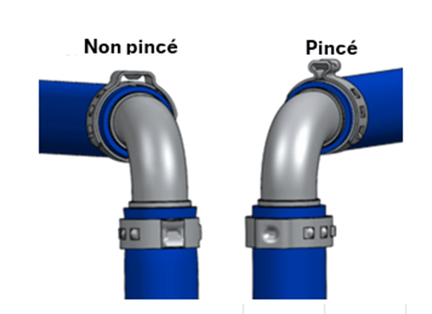Inspectez le collier pour confirmer que le raccordement est sécuritaire. Il est facile de vérifier le serrage en inspectant visuellement l’oreille du collier. Celle-ci doit avoir la forme illustrée dans le dessin, qui montre un collier avant qu’il soit pincé (à gauche) et un collier pincé ayant la bonne forme (à droite).