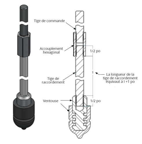 Vous allez devoir déterminer la longueur de la tige qu’il vous faut si jamais vous devez remplacer la tige de raccordement qui unit la tige de commande et l’accouplement à la ventouse. Cela sera facile si vous connaissez la profondeur d’enfouissement de votre prise d’eau indiquée dans le dossier d’installation. Mais ne vous inquiétez pas si vous ne connaissez pas cette information. Vous pourrez la mesurer facilement comme indiqué dans l’image ci-dessous. La longueur de la tige de raccordement équivaut à la mesure entre l’accouplement hexagonal et la ventouse + 1 po.