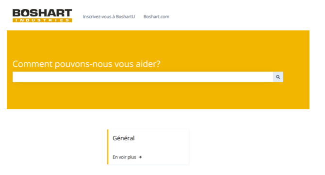 Vous pouvez trouver des réponses sur notre site web : https://boshart.com/fr-ca/. Il suffit de cliquer d’abord sur « Éducation » et ensuite sur « Base de connaissances ». Cela vous permettra d’accéder à un moteur de recherche où vous trouverez facilement de l’information sur des centaines de questions fréquemment posées. C’est un outil fort utile, autant pour notre équipe de vente que pour notre clientèle.