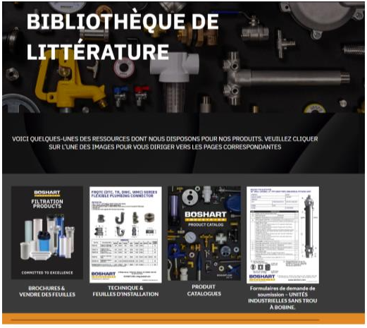 Vous trouverez des brochures, des fiches techniques ou d’installation, et des attestations de conformité sur notre site web, au https://boshart.com/fr-ca/. Cliquez d’abord sur « Éducation » et ensuite sur « Bibliothèque de littérature ». Vous pouvez aussi accéder à celle-ci en suivant ce lien : https://boshart.com/fr-ca/literature/.