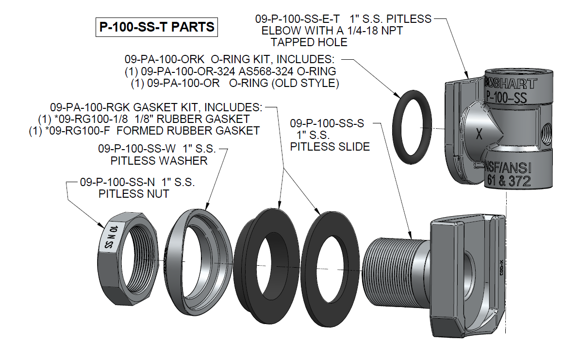 The diagram below details the replacement parts for the model P-100-SS-T 304 Stainless Steel Pitless Adapter.