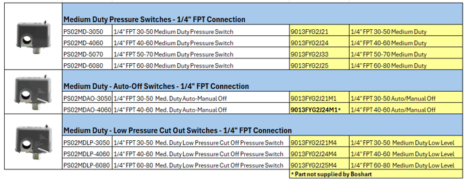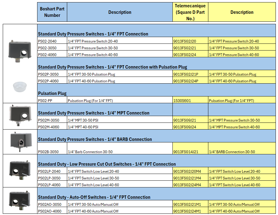 Square D 9013FSG & 9013FYG Pressure Switch Cross Reference to Boshart PS02 & PS02MD Series
