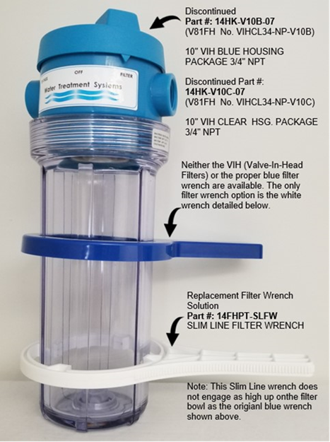 You will need to order the Slim-Line Filter Wrench, part number 14FHPT-SLFW. It works on the bowls which have a smaller diameter. However, the Slim Line wrench it will not engage as high up on the filter bowl as the original blue filter wrench for the VIH series as shown in the photo.