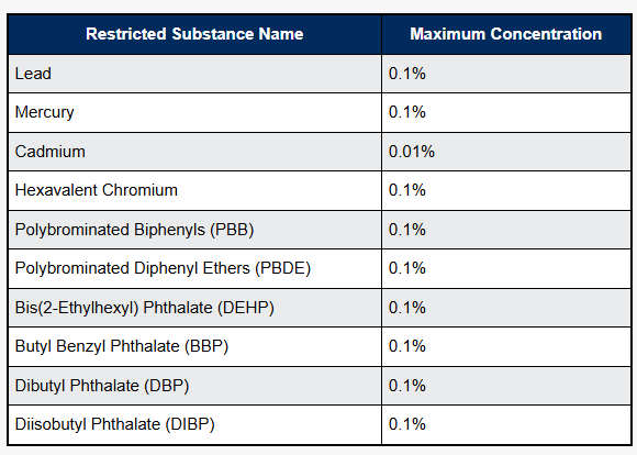 It currently restricts the use of ten substances: lead, mercury, cadmium, hexavalent chromium, polybrominated biphenyls (PBB), and polybrominated diphenyl ethers (PBDE), bis(2-ethylhexyl) phthalate (DEHP), butyl benzyl phthalate (BBP), dibutyl phthalate (DBP) and diisobutyl phthalate (DIBP). All products with an electrical and electronic component, unless specifically excluded, have to comply with these restrictions.