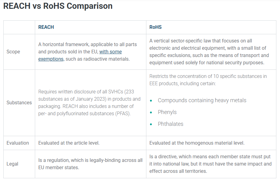 The European Union (EU) Registration, Evaluation, Authorization, and Restriction of Chemicals (REACH) Regulation and the Restriction of Hazardous Substances (RoHS) Directive have many things in common. They restrict the use of potentially dangerous substances in all products sold. Both the EU REACH Regulation and the EU RoHS Directive aim to reduce and restrict substances that can be deemed harmful to humans and the environment.