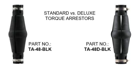 While not being noticeable at a glance, there are a number of notable differences between a “Standard” TA-48-BLK vs. a “Deluxe” TA-48-BLK Torque Arrestor. These include the overall part weight difference of 5 plus precent, approximately 40% difference in flexibility or force required to deflect the torque arrestor outwards for installation, the brand of clamp supplied as standard and an increase in the price for the deluxe. The price difference is due to both the increase in material molding cycle time for thicker crass section as well as the standard model produces more parts per molding cycle for more efficient manufacturing resulting in a cost reduction.