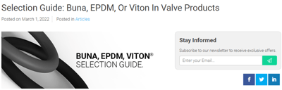 Article: “Buna, EPDM, Or Viton Selection Guide” by Flomatic Valves to be a useful resource https://www.flomatic.com/news/buna-epdm-viton-in-valves-selection-guide/